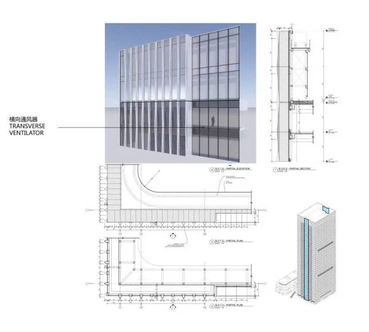 T3塔楼幕墙系统:芯光大厦塔楼采用VRV系统空调系统。在东西两侧立面设置通风百叶,遮挡设备平台,在设计之初将设备百叶纳入设计考虑因素,可以使设计更完整。