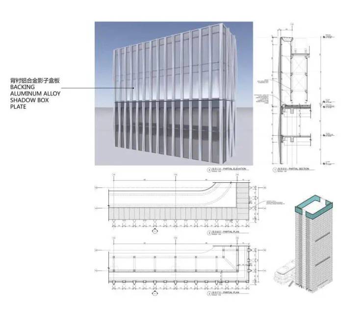 T2塔楼塔冠幕墙系统:为保证塔楼整体效果,塔冠后侧背衬铝板,遮挡结构构架与设备。泛光照明结合竖向装饰条布置,突出建筑天际线效果,打造城市地标。