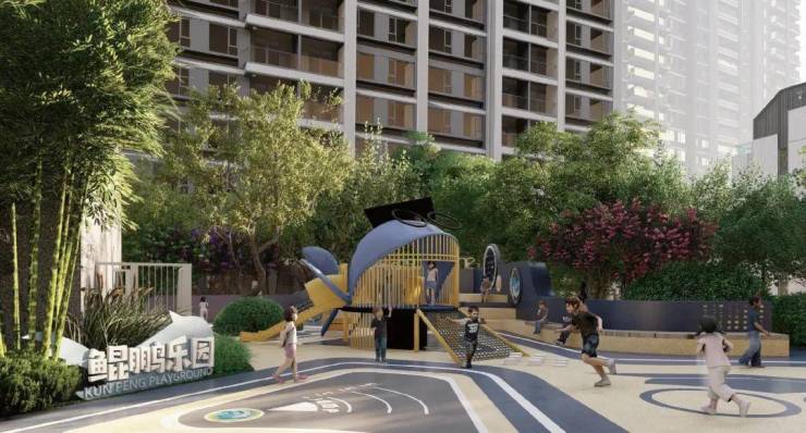 以“鲲鹏乐园”主题儿童乐园、鲲鹏书院、老人颐乐空间、多元艺术花园、约760m“汽车文化”主题跑道、森林漫步道等共享场域为居者构筑一个有温度的社区。