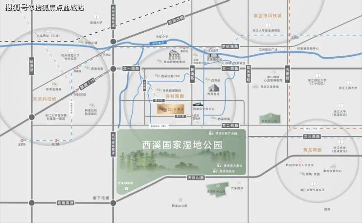 【城市干道】:横向上,余杭塘路,文一西路,文二西路由东向西串联起了杭州老城区和未来科技城。纵向上,绕城高速、紫金港路、古墩路由北至南串联起了浙江大学以及西溪湿地。