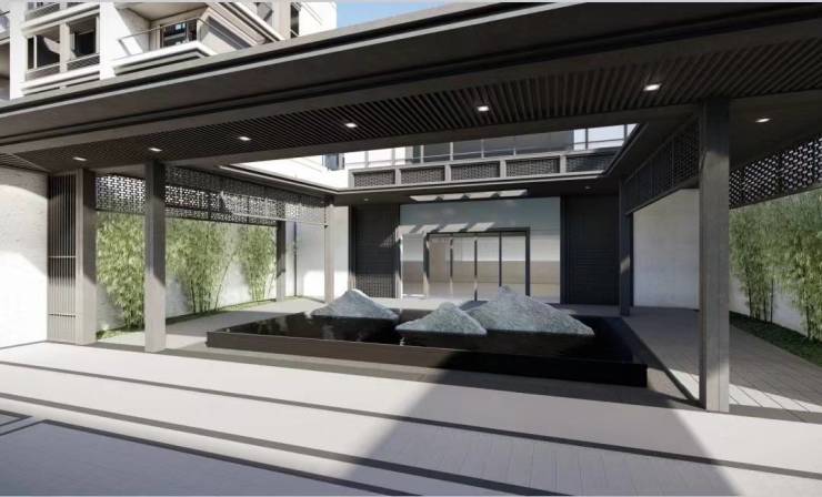 大气威仪之厅,迎接四时晴雨,耸立池中之石,仿若连绵山川之势。