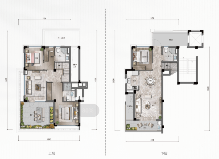 ·现代叠墅:“双首层”设计,首层层高约3.5米;户户有院、层层有园,大面积可拓展空间