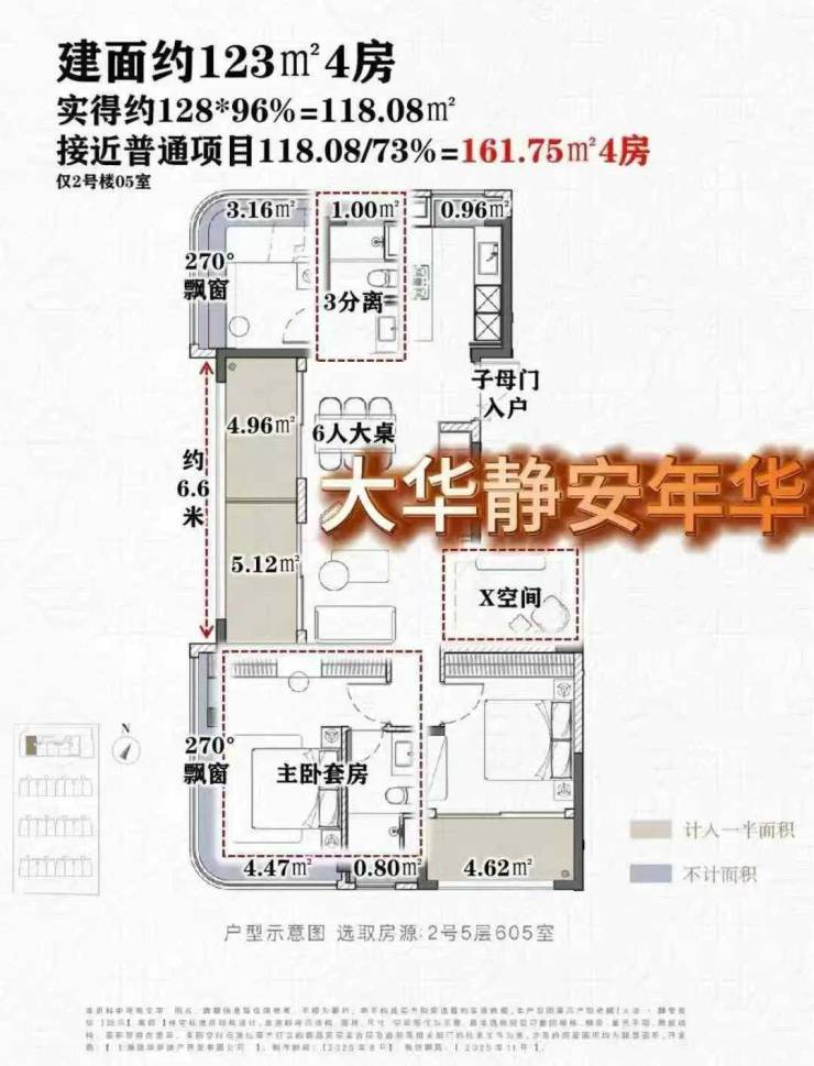- 建面约123㎡震撼客餐厅: 面宽约6.6米,拓展双阳台后面积达约40㎡(媲美150-160㎡尺度),空间开阔完整,社交宴享无忧。多功能灵动空间,满足收纳、书房、亲子等多重需求。