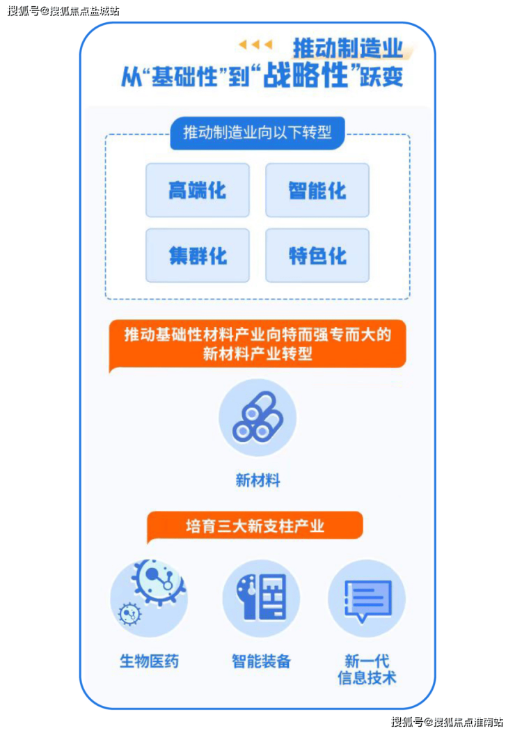 制造业向高端化、智能化、集群化、特色化转型,推动基础性材料产业向特而强、专而大的新材料产业转型,培育生物医药、智能装备、新一代信息技术三大新支柱产业。