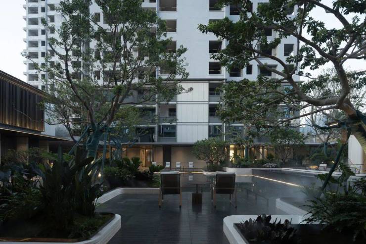 穿过大堂,步入园林,一场沉浸式的松弛度假之旅正式展开。约147米风雨连廊,24小时光幕温柔守护,晴雨皆成景致。动线串联400㎡下沉星光水院,叠级水景与龙鳞纹底板暗合“龙口衔财”吉祥寓意,潺潺流水声更似天然白噪音,轻抚心境。水院中的“星海岛屿”汲取新加坡W酒店设计灵感,与聆星会客厅无缝衔接,共同构筑社区中央的社交主场。