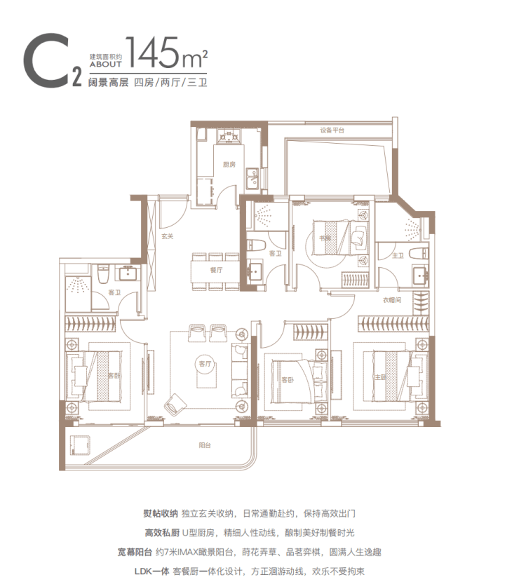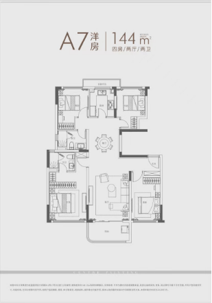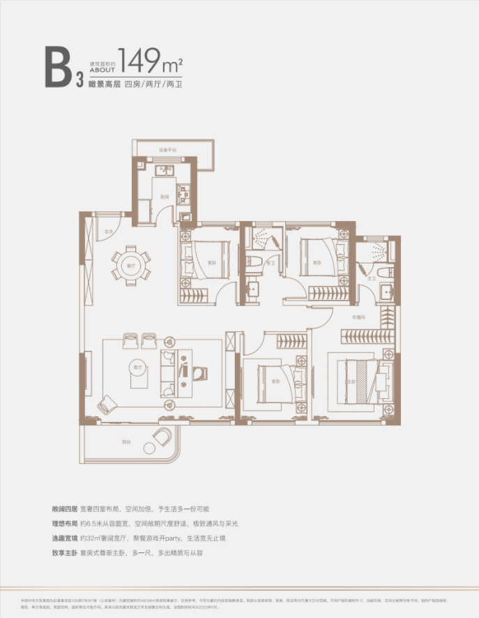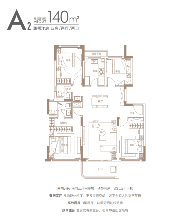 建面约140㎡四房:三开间朝南户型,南北通透,采光条件优质,客厅明亮宽敞,彰显大气布局。