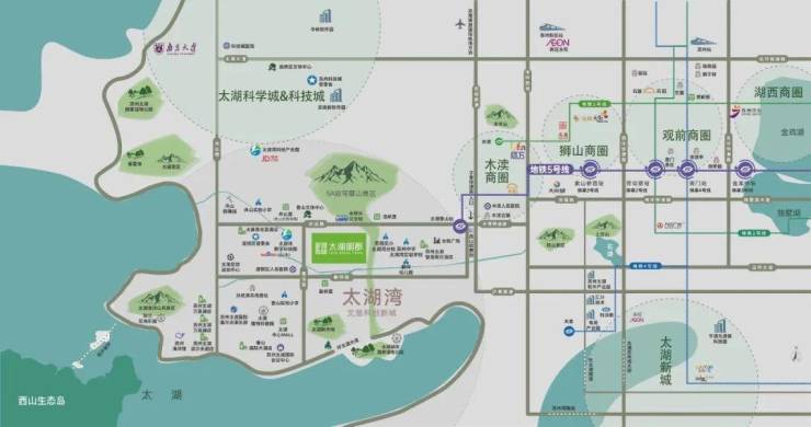 【生态环境】背山靠水:项目周边有不可复制的环境资源,苏州有两个国家级度假区,一个是阳澄湖国家旅游度假区;另一个就是我们太湖国家旅游度假区,太湖湾区,北靠穹窿山(5A级风景区),南临太湖,整体格局背山靠水,环境宜居,生态宜人;