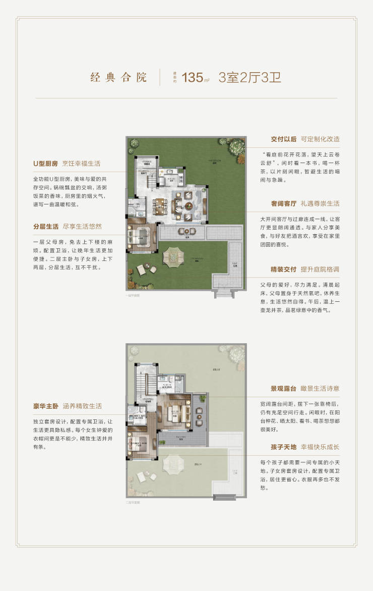 户型面积约125-200㎡,戗角飞檐、木门铜锁,独门独院,中式花窗与院墙之间围合的江南院子,平均每户院子和建筑面积达1:1以上,精装修交付。