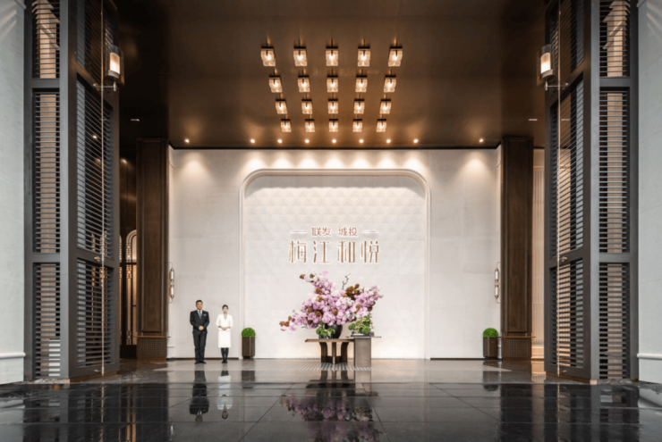 联发城投·梅江和悦精研实景示范区品质,从选材、设计理念、人性化细节三个方面打造最美回家路。社区入口屋顶高达9米,由深色古铜金不锈钢密拼而成,礼序台阶由加厚的黑金沙大规格整石定制而成,整体效果沉稳大气;四季花厅采用外双层内通高的建筑结构布局,形成开放而流动的空间感受;车马厅将顶部管线藏身综合支吊架,地面采用 环氧地坪 漆,视觉更为明亮开阔,同时灯带随行点亮,营造专属、暖心的归家氛围。