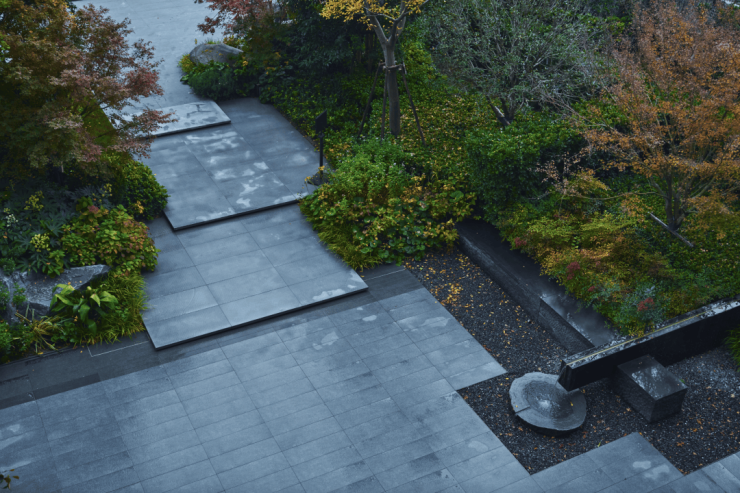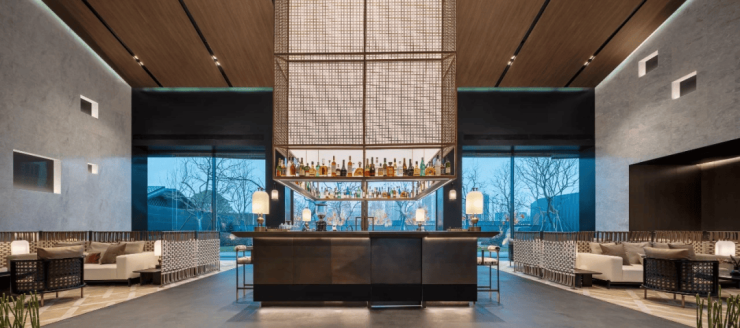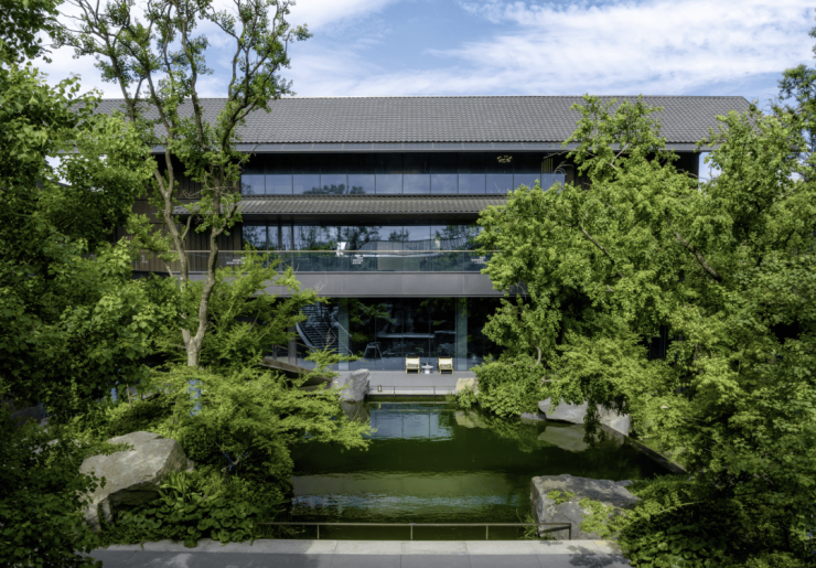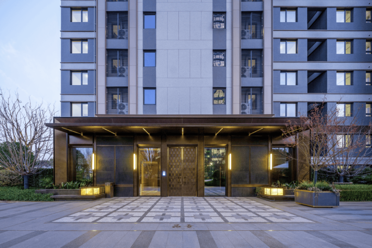 铜制精工门、大屋檐造型、照壁、两侧丹桂树,再配上三重门,透露着东方神秘感,营造出“低调隐奢感”