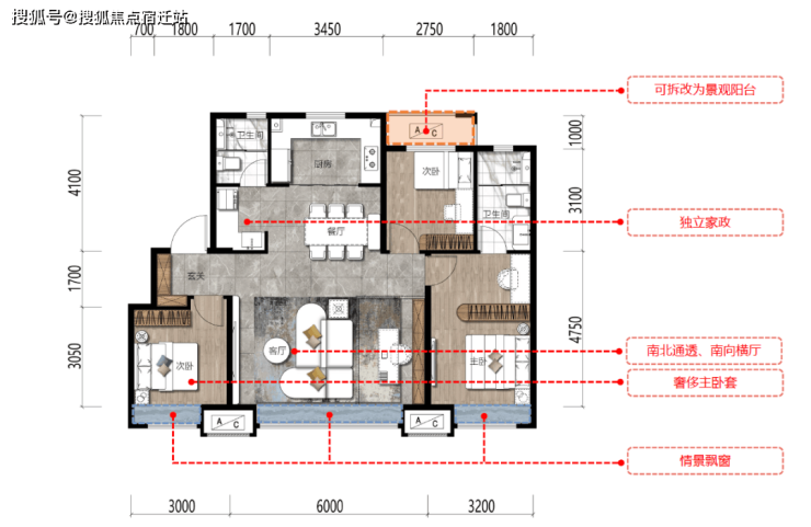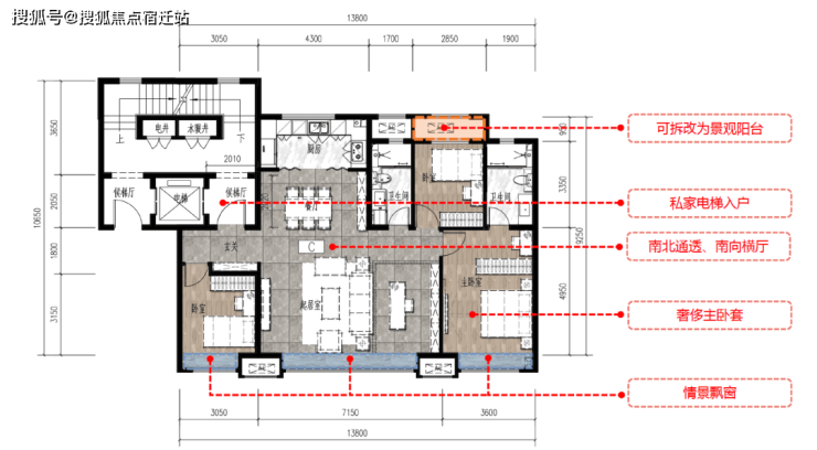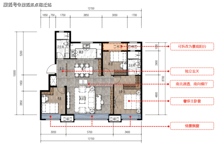 【113㎡】三房两卫户型,约5.7m宽横厅、4m宽餐厅、2m高落地窗,入户玄关强收纳,设备平台拓展北次卧扩大赠送率,诸多亮点差异化竞品。