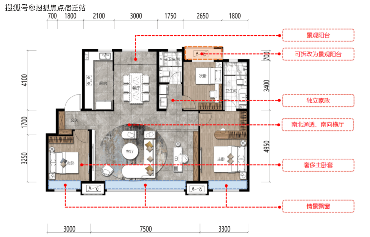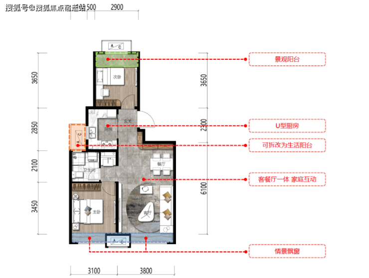在户型的设计上,通过精准推敲空间尺度,打造宜居空间布局、舒适的流线设计和溢价赠送空间。紧凑的空间布局,不浪费每一寸面积;两卫及干湿分离设计彻底解决卫生冲突;家政空间或生活阳台让家更整洁;独立玄关让出入更方便;U型厨房同样的面积更多的使用空间;情景飘窗符合多元品味的更多选择;餐客厅一体让空间更开阔;景观阳台、超大设备平台,更多赠送空间。