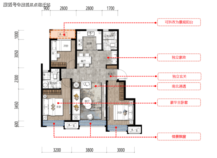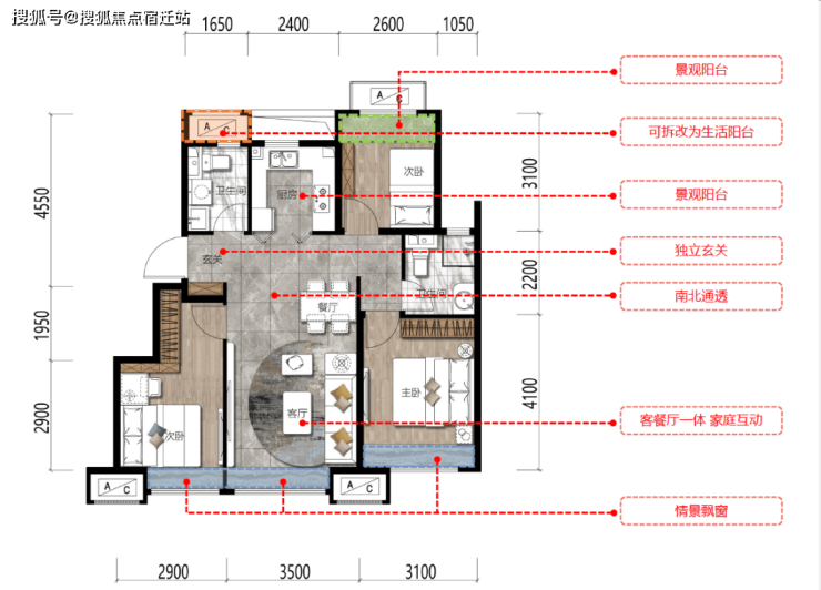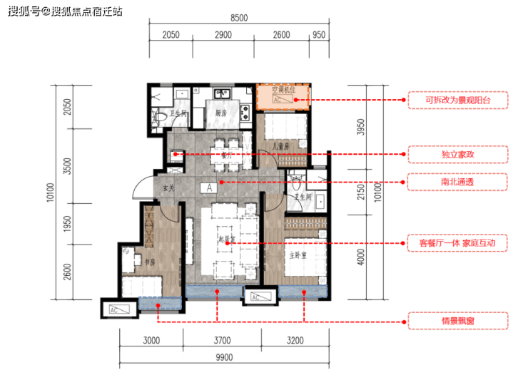 【99㎡】主力三房产品,两卫三面宽设计,南向生活阳台,独立餐厅空间,功能及舒适度上碾压竞品传统三居100㎡产品,以小面积段功能舒适度优胜。