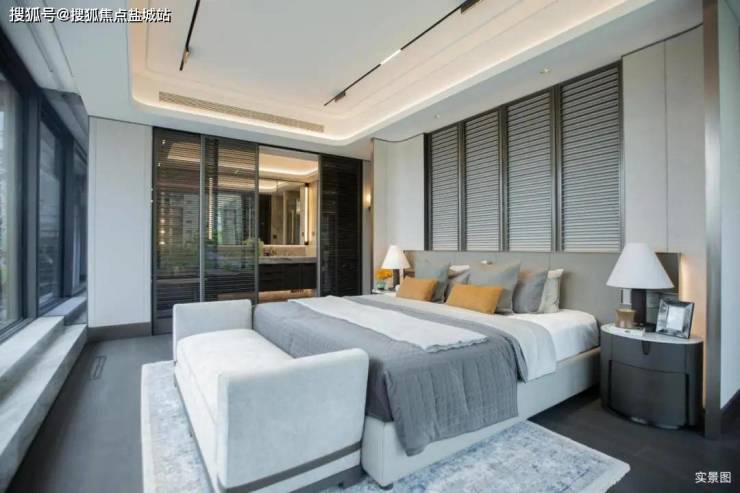 樾青岚的户型,每个都有大面宽,和整块的大面落地玻璃,这是一个洒满阳光的合院。因此樾青岚整个立面用了大面灰蓝的玻璃,不仅有清亮的通透感,更保护主人生活的私密性。在落地窗上,镶上金色铝线条“油画框”,再辅以金属引檐,金色的露台栏杆底座,金色的格栅院门,完成“金”之描摹,犹如一幅巨幕画框,呈映天光云影。