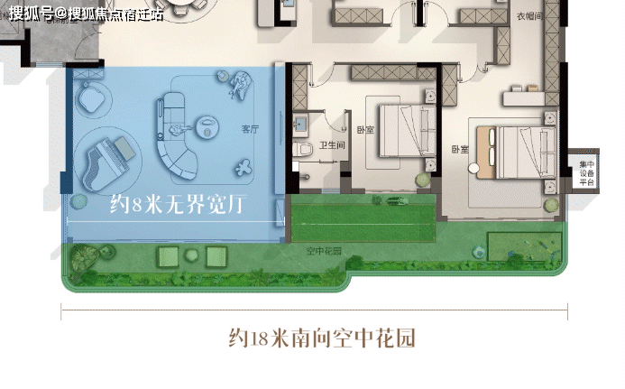 强调庭院与室内空间的互通,南向连接的约18米空中花园,