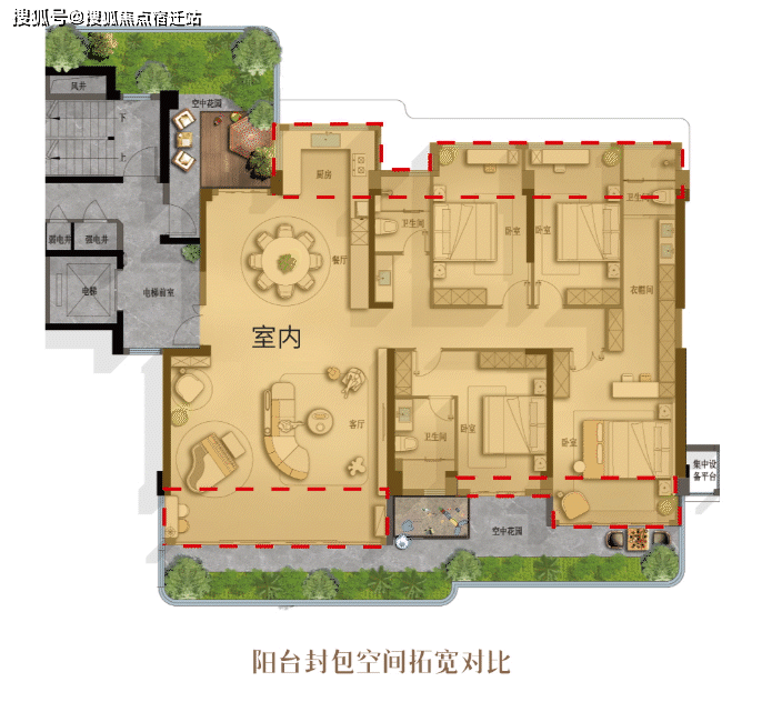 传统的四代宅仅通过扩大露台绿化来增加面积,实际居住体验一般。