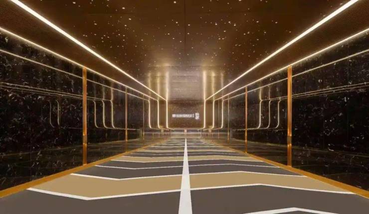 地下室公区同样出自大师设计——美国CDI创意国际设计集团,下车坡道星空顶加流线型灯带,玫瑰金属包边,两侧的墙面同样采用进口奢石,质感非凡。停车场地面采用水磨石及环氧地坪漆,不仅耐磨性更强,也更有质感。双大堂设计,仪式感必须给到位!