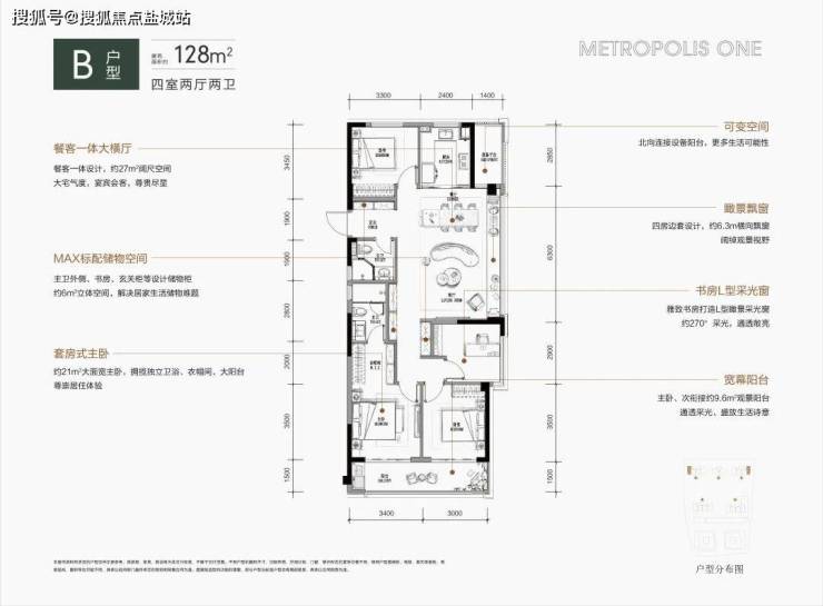 约128平方米的户型提供了宽敞舒适的居住体验。其四房边套设计不仅优雅且实用,餐客厅一体化布局配合飘窗,不只拓宽了视野,还为家庭聚会创造了理想空间。在此,无论是家庭成员间的互动还是与朋友的欢聚,都格外温馨和谐。