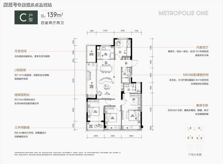 约139平方米的户型则展示了对生活品质的追求,宽敞的大厅设计让居室显得开阔,双阳台和双飘窗的设计巧妙地分隔了生活与休闲区。这样的环境使得每天的居住都成为享受。4室2厅2卫餐客厅阳台一体化,近约29.7㎡开阔空间,9.4m南向三开间,双飘窗设计约25.8㎡套房式主卧奢华衣帽间