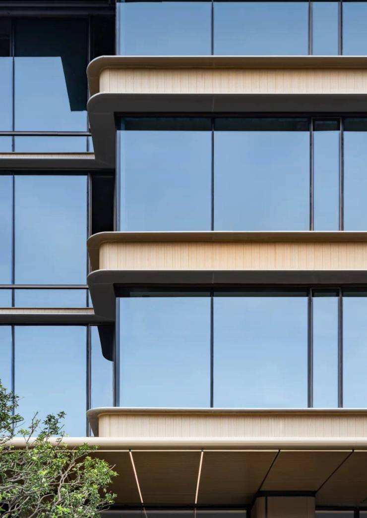 游廊墙面上用的是星灰釉陶板,而外立面上用的则是金釉陶板。保利明湖金茂府复刻的是伦敦豪宅Principal Tower的金釉陶板立面,它的造价比石材更昂贵。到了晚上,从近处看,是金色大门的温柔映照,从远处看,保利明湖金茂府会成为宁波东部新城里的一座醒目灯塔,与宁波中心交相辉印。