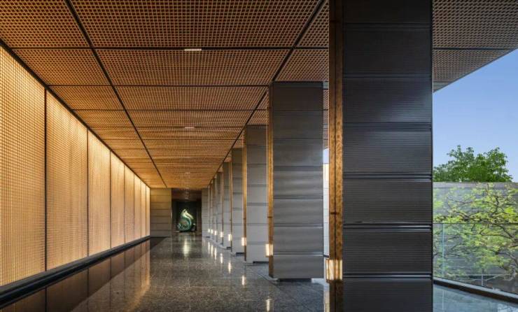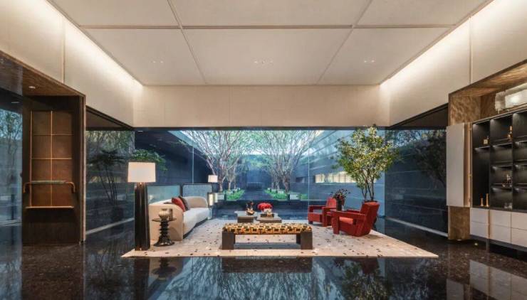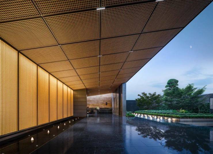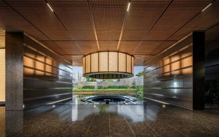 保利明湖金茂府是把回廊、大堂和大门串联在一起,形成一整个「地面大堂系统」;又把地面和下沉式庭院嵌套在一起,共享同一片乌桕林的好风景。