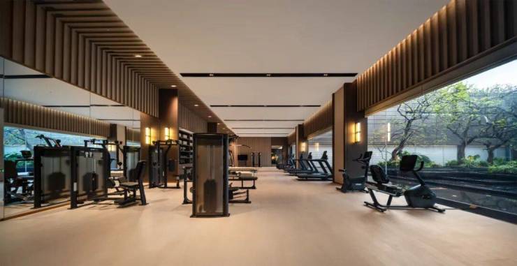这些乌桕种下去才一个多月,叶子都是新长出来的。它们的枝叶与树影,摇曳在行政酒廊里,映照在室内恒温泳池里,弥漫在健身房和瑜伽房里。功能强大的会所空间,就这样环绕着下沉式庭院,你随时都能看到这片在秋天萌发新叶的乌桕林。