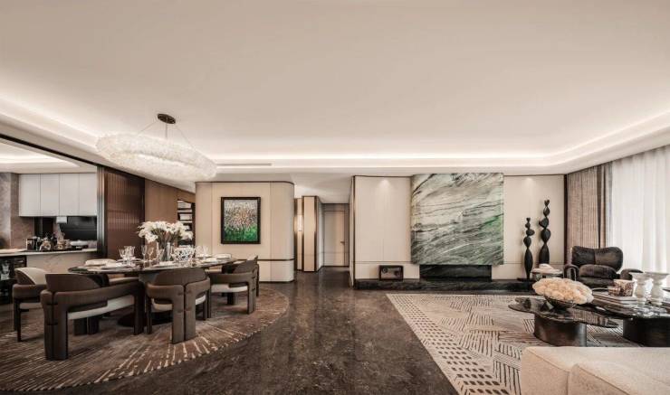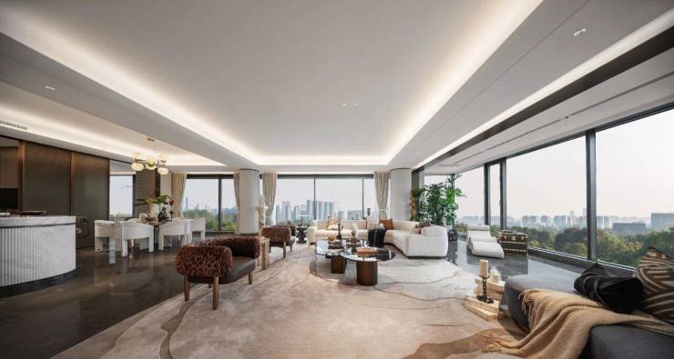 建筑面积约350平米的独层独户,地面是大面积的石材通铺。它的南向面宽达到约25米,客厅的公区做了270度的大面幅转角窗,将鲜活的城市夜景最大限度地做成你的居家背景,让你隐于市城。