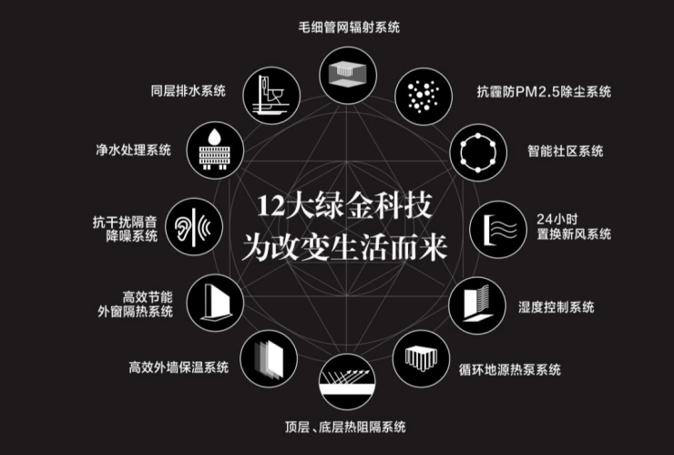 ①智能社区系统 ②24小时置换新风系统 ③温度控制系统 ④循环地源热泵系统 ⑤顶层底层热阻隔系统 ⑥高效外墙保温系统 ⑦高效节能外窗隔热系统 ⑧抗干扰隔音降噪系统 ⑨净水处理系统 ⑩同层排水系统 ⑪毛细管网辐射系统 ⑫抗霾防PM2.5除尘系统