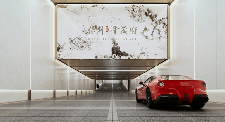 保利明湖金茂府还在地库下了重工。地库坡道石材通铺,他们专门为豪宅用户设计了一条坡度更缓的跑车车道,和入口更高、宽度超宽的房车车道。当你开着心爱的豪车进入车库,头顶的呼吸灯带会随着你一起渐进点亮;在加宽加长的车位上停好车,顺手把后备箱的杂物放进车库储藏柜,走进对称门仪设计的地库入户大堂,每天的车行归家路也充满仪式感。