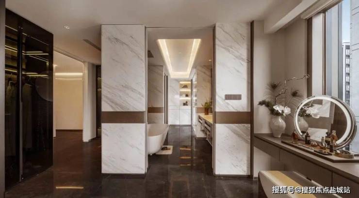 最大的主卧套间足足有55㎡,相当于把酒店行政套房搬到了家里。超豪华衣帽间,配置了男女主分开收纳区和化妆台;卫浴间用了高奢酒店同款双台盆和大浴缸;卧室全景落地玻璃窗。