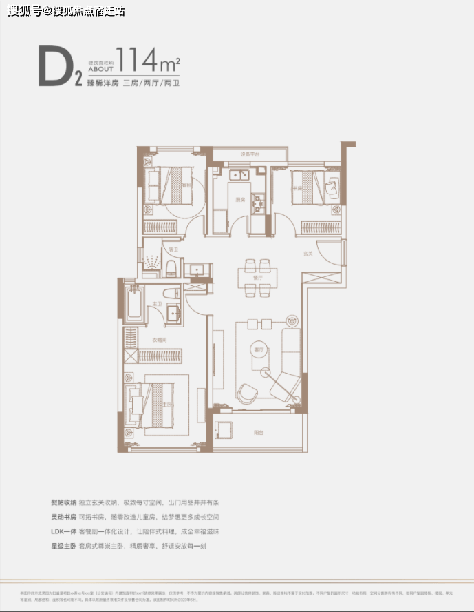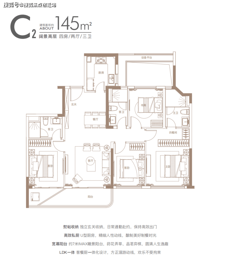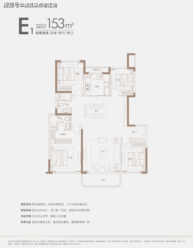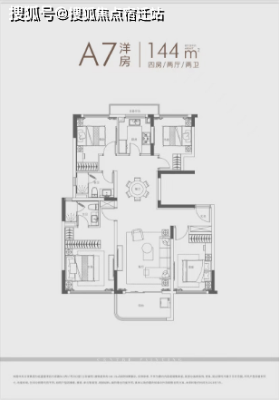 建面约140㎡四房:三开间朝南户型,南北通透,采光条件优质,客厅明亮宽敞,彰显大气布局。