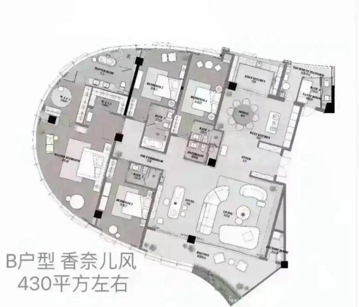 户型面积 约430-450㎡大平层,4房+1房2厅6卫配置12