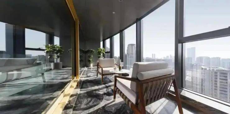 超大弧形阳台:户户配置11-17米长、进深2-3.5米的弧形阳台(面积约30㎡),花池种植绿植形成“CBD绿轴”,单此项成本超1亿,媲美蓝色钱江江景大宅的传奇阳台2。