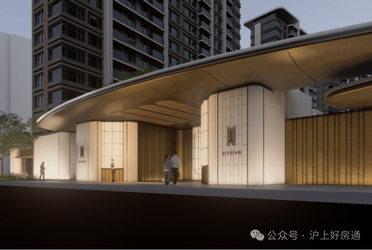 蓝灰色玻璃+仿石铝板+艺术涂料材质,穿插优雅线条,让建筑这张“脸”看起来更高级。One&Only酒店式门头。用雕塑体块、温润弧面和雅致线条,营造具有艺术格调的归家仪式感。