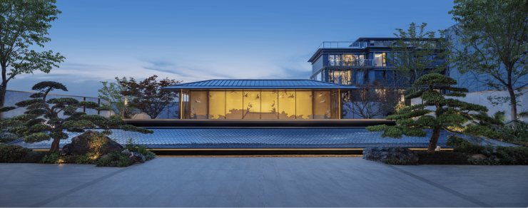研习《营造法式》之精巧,提取宋朝代表性建筑中的中式重檐屋顶、木作构件元素,甄选铝板、石材、LOW-E玻璃、高档真石漆为主材,辅以金属格栅进行全新演绎,打造简雅秀逸的宋风公建化立面。