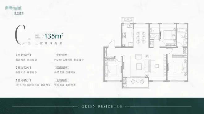 此户型可以说是改善人群非常喜欢的户型,建面约135㎡3房2厅2卫设计,动静分区,四开间朝南,各空间尺度奢阔,还有一个超大面宽的景观阳台,实现功能性和舒适度兼得。