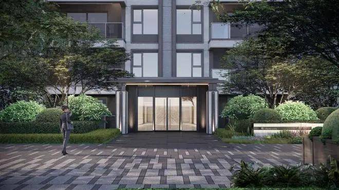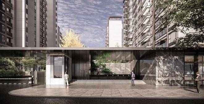 社区大门完全区分人行、车行入口,人行入口采用石材与玻璃搭配设计,大气恢弘!门厅景观水院精致高级,入户仪式感满满!