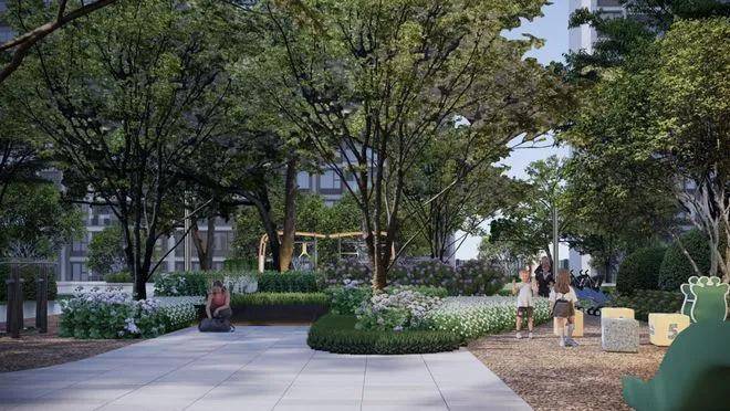 项目规划了“一环一轴三园”景观节点,以高密度绿意景观包裹整个小区,打造绿氧环绕的公园住区。