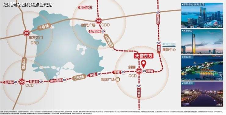 双轨交汇 黄金四角环湖四轨交汇,缔造金鸡湖黄金四角,西北-东方之门、东北-时代广场、西南-李公堤、东南斜塘老街一黄金四角所在核芯价值所向。