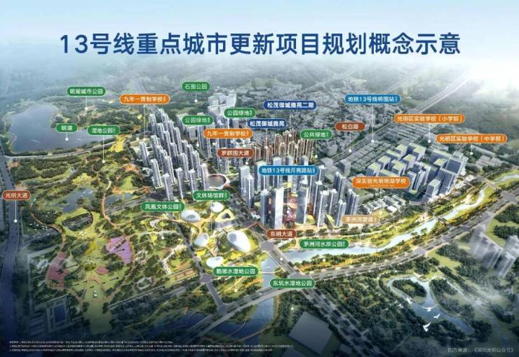 项目位于广深港科创走廊重要节点的“世界一流科学城”光明,归属凤凰城街道,邻建面约383万㎡13号线重点城市更新单元(在建),占位光明城市发展的“价值洼地”,同享磅礴产业规划红利。13号线重点更新项目(在建),总投资约420亿元,其体量约为光明城站TOD的25倍。将结合13号线月亮路站塑造、城市蓝绿公园网络提升、产城空间更新,无限链接生产、生活、生态要素,建设成光明区“三生融合示范区”。