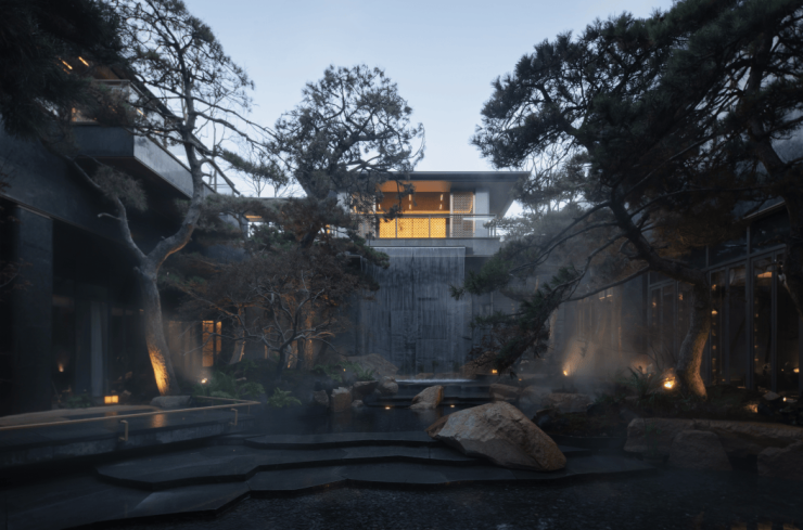 以传统园林为造园灵感,迎龙观月将自然与建筑融为一体。效仿寄畅园从惠山引来泉水营造“八音涧”的创举,还原出【松涛飞瀑】的山水意境。