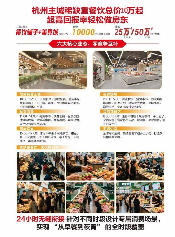 【产品亮点】:主城稀缺可油烟重餐饮美食城,以及24 小时不间断服务 + 业态零重叠 + 产品独家性