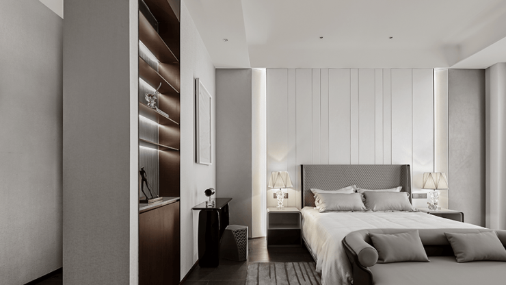 主卧在走道里侧,确保了房屋主人的私密性,也带来一丝安稳,舒缓基调下,整体层次缓和过渡,线条和体块有序排列,墙面结构的改变推导出视觉中心,橡木地板和墙布在灯光烘托下,搭配出细腻柔和的氛围,窗前一张靠椅 一盏灯具,在安宁静谧的时光中 寻得自在!