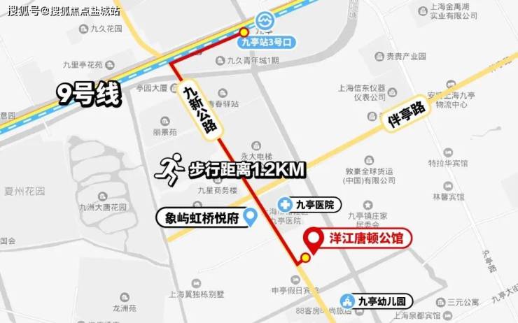 【洋江唐顿公馆】位于南九亭,距离9号线九亭站约1.2公里,可以乘坐离项目约100米左右的松江40路抵达。