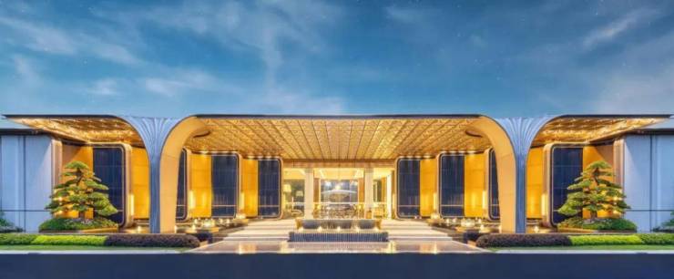棠悦芳华轩大门实景:萃取东方礼制精髓,沿东西向主轴设置多重归家院落,形成主入口至迎宾水院及度假水池为一体的礼序归家轴。层层递进的空间,在步移景异中,营造出多重归家仪式。