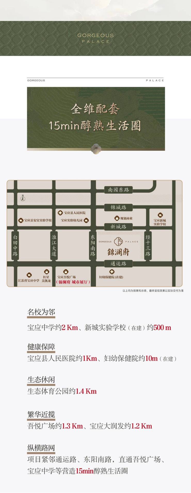 配套规划:打造15分钟醇熟生活圈,周边约2公里内有宝应中学、新城实验学校(在建)、宝应县人民医院、妇幼保健院(在建)、生态体育公园、吾悦广场、宝应大润发等教育、医疗、商业及休闲设施。