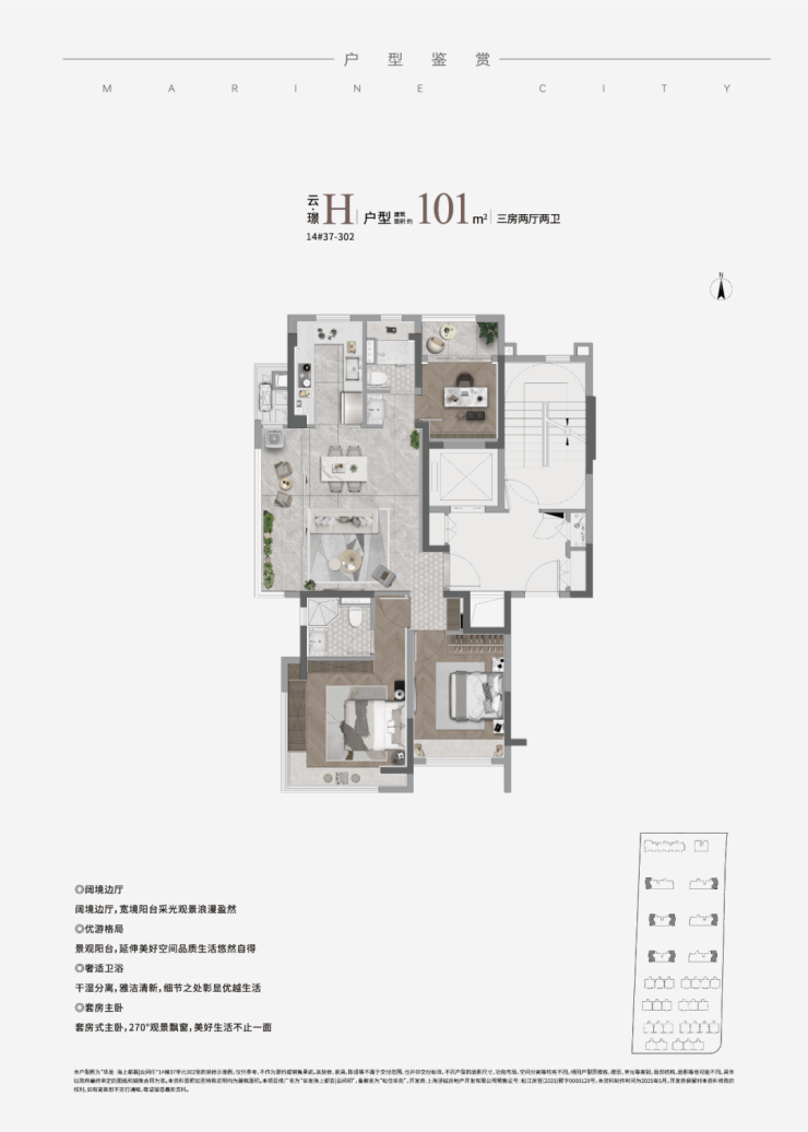 部分约100-101㎡H边厅户型,全景阳台搭配主卧L型转角大飘窗,三面采光+270°环幕视野,景观面堪比豪宅尺度。