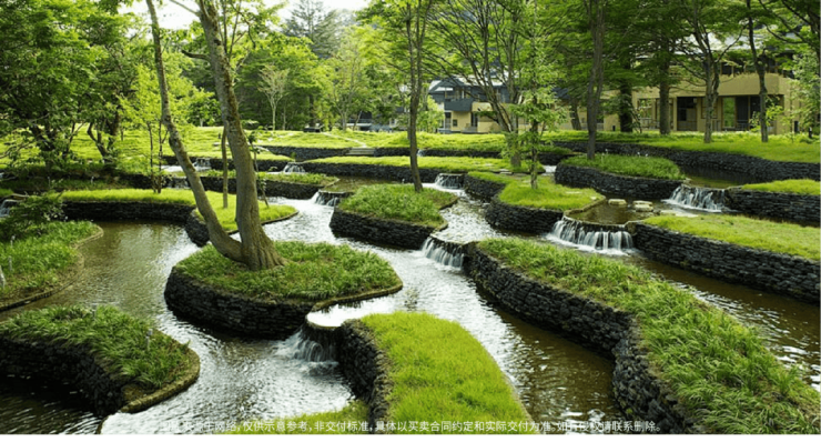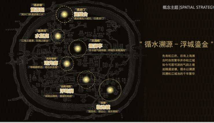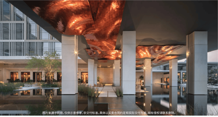 在项目景观设计上由朗道国际景观设计团队操刀(代表作上海融创滨江壹号院、上海万科中兴路一号),从古松江五大浦之一的通波塘上提取灵感,同时以海派水韵为基底,将“循水溯源,浮城鎏金”的设计理念贯穿了整个项目,主打引水入园,让人身临其境、可居可游。