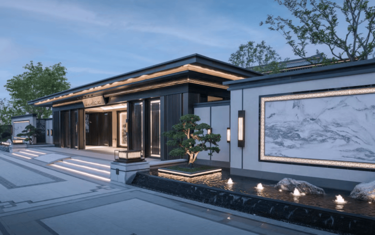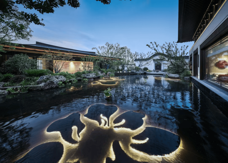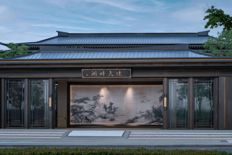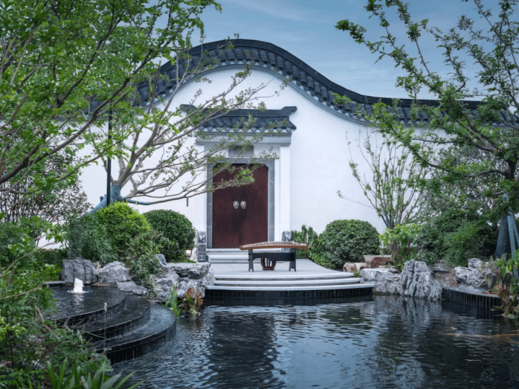 在此,气势恢弘的入口大门由中式对称形象景墙、仪式水景衬托,松风傲骨掩映前庭影壁,层层递进之间,彰显非凡礼序,匠筑嘉树礼门。踏入其中,首见巨幅照壁,一幅立体展示江南景色的画卷即刻呈现在眼前。其画面大开大合,云、水、山、树布置得宜,阡陌河湖穿插有致,造就一番引人入胜的情致。