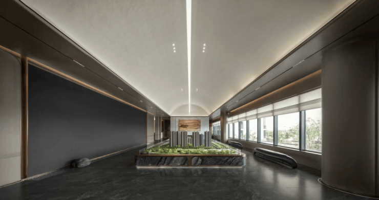 现代、高远、展望是沙盘空间的关键词。有意为之的穹顶设计加高了空间视野高度,变幻的电子屏幕强化了人的感官体验,空间的现代气息由此而浓郁起来。
